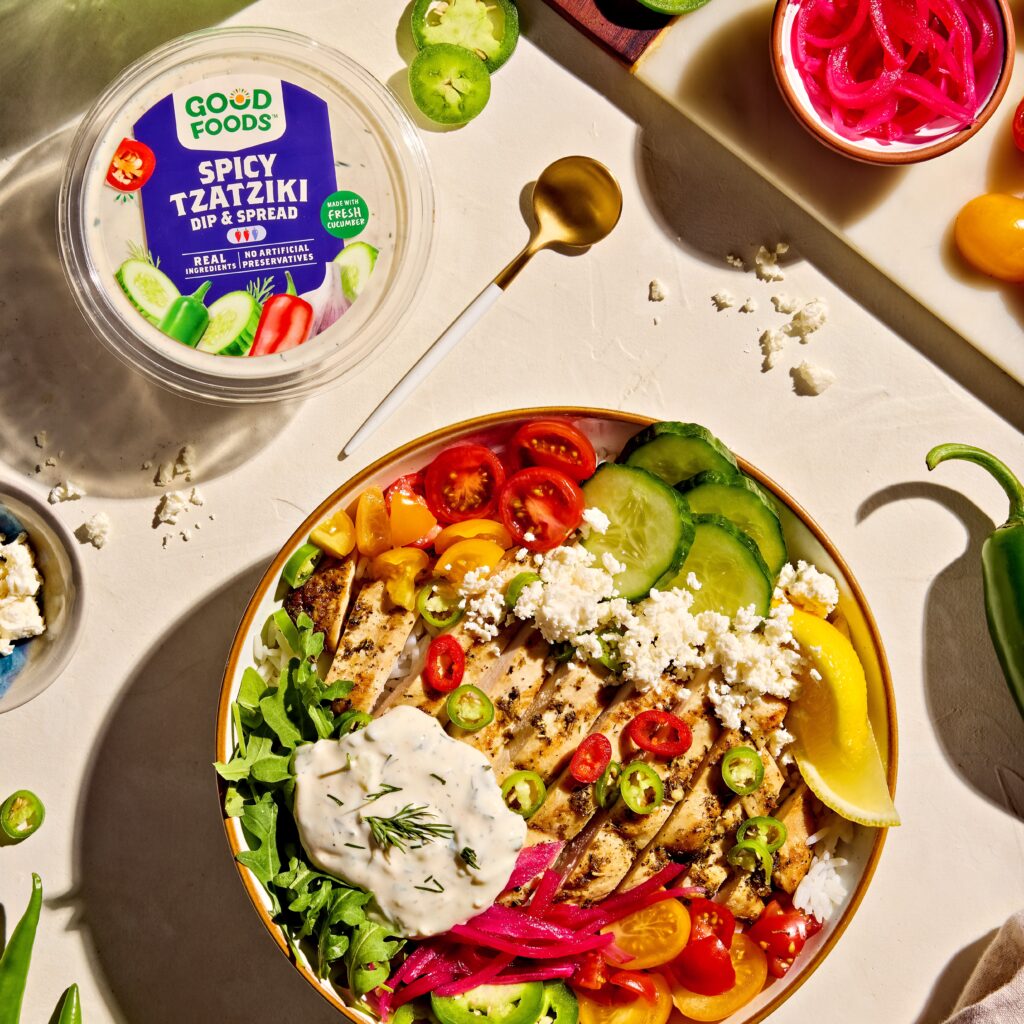 Our Spicy Tzatziki Dip is a creamy-meets-fiery remix of the classic. Cool, refreshing cucumbers and rich Greek yogurt are balanced with jalapeño and serrano peppers for just the right kick, delivering bright, herby flavor with a little heat behind it.